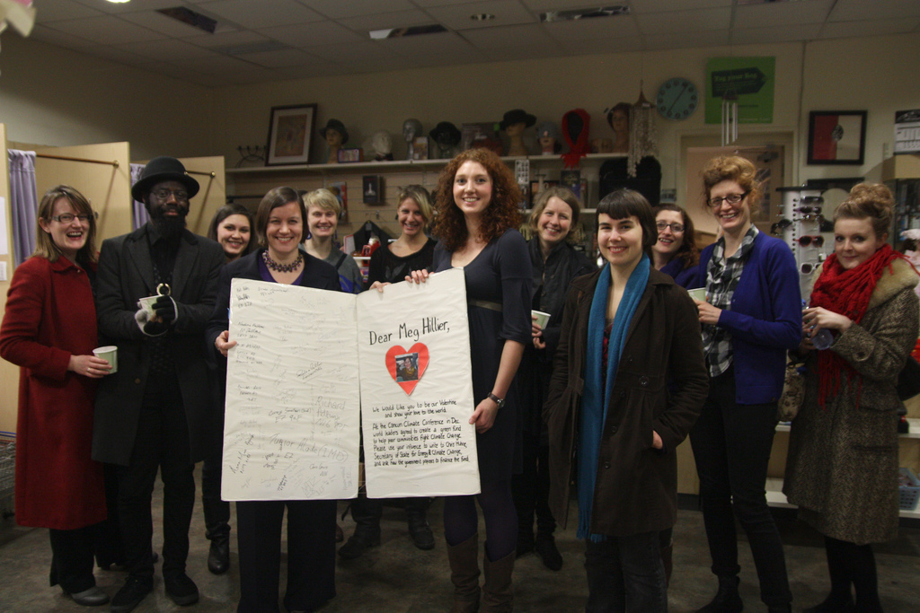 As I worked my way around the shop, it was a hive of activity. A clothes swap was on the cards later in the evening, so people were busy giving in their clothes and making tags to give the new owner a little bit of its history. In the corner, people were creating Valentine’s cards for their MPs, asking them to contact Chris Huhne, Secretary of State for Energy and Climate Change. The action was to hear how the government planned to contribute to the newly created global green fund. As part of the evening, Hackney MP and Shadow Secretary of State for Energy and Climate Change, Meg Hillier, was there to receive her card signed by over 40 of her constituents. I caught up with her to ask a few questions….